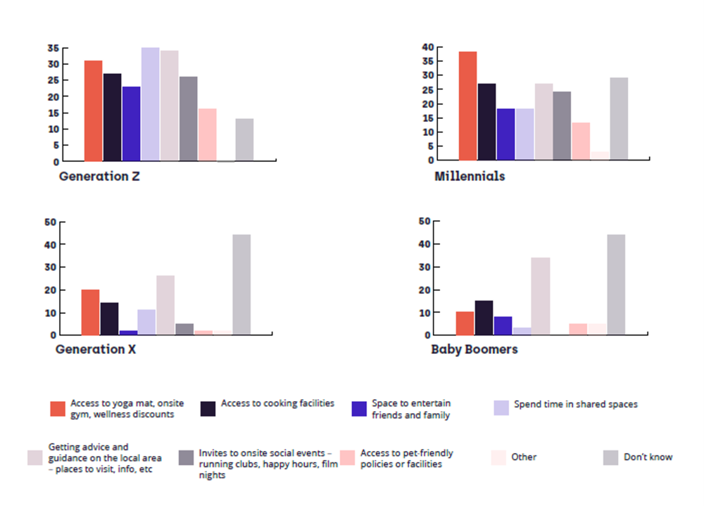 Another interesting result is the number of times different age groups answered ‘don’t know’ to the questions regarding accommodation features that they consider important: Gen Z said this far fewer times than any other generation. Taking a broad view, this backs up our qualitative data that says, ‘Gen Z know what they want and aren’t afraid to ask for it’.